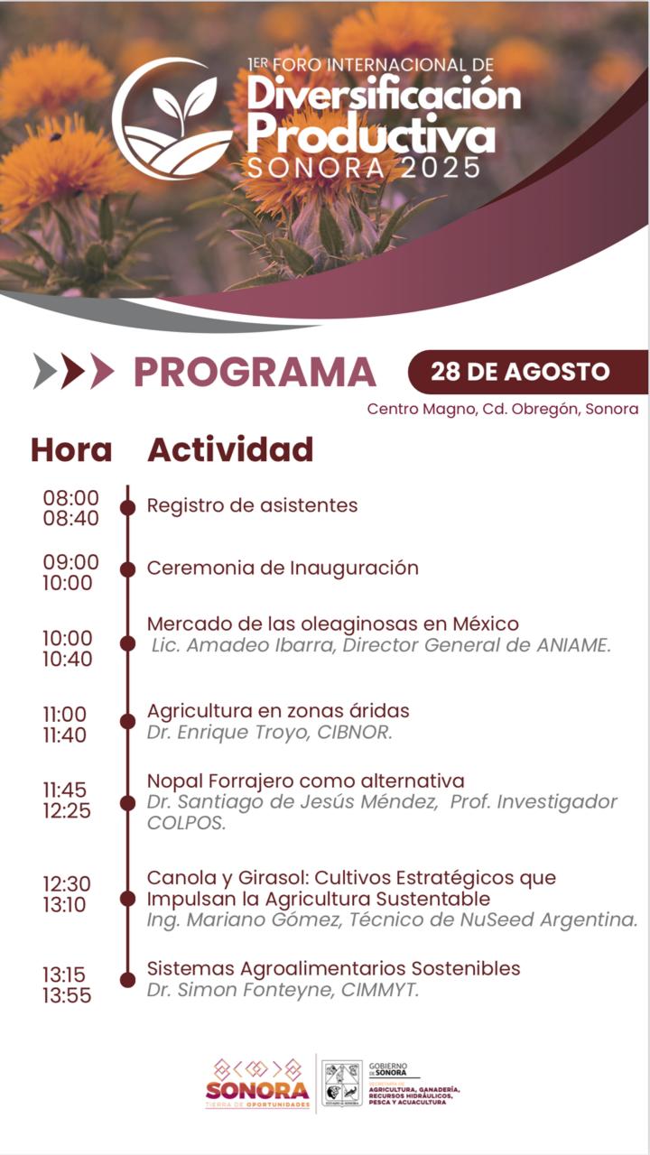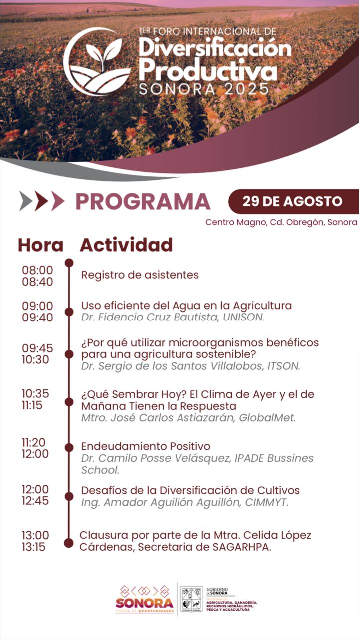 Hermosillo, Sonora; 18 de agosto de 2025.- Para impulsar la reconversión agrícola, la innovación tecnológica y la diversificación productiva como ejes estratégicos frente a los retos del cambio climático, el Gobierno de Sonora, que encabeza Alfonso Durazo, llevará a cabo el Primer Foro Internacional de Diversificación Productiva en Cajeme.